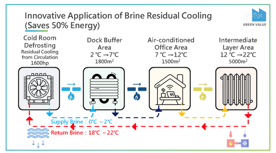 該物流中心位於桃園,設有四台冷凍機組,並採用 Neutragel® Neo 作為二次冷媒,確保冷凍庫溫度維持在 -18°C 以下。