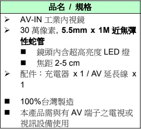 5.5mm CMOS鏡頭:可輕易進入狹小的工作空間中檢視狀況,檢修更容易